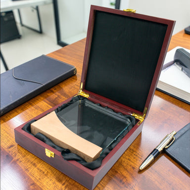 Present achievements with elegance using this beautifully crafted Wooden Trophy Design Plate, perfectly paired with a luxury wooden presentation bo...