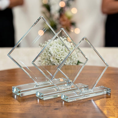 Introduce excellence and timeless elegance with our premium crystal award — a striking diamond-shaped crystal trophy on a sleek black base, perfect...