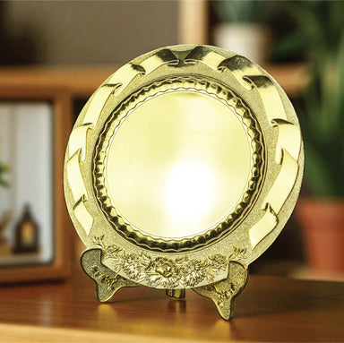 This is a large, heavy decorative metal disk plated in gold designed to serve as a showpiece or ornamental plate. The front surface features a broa...